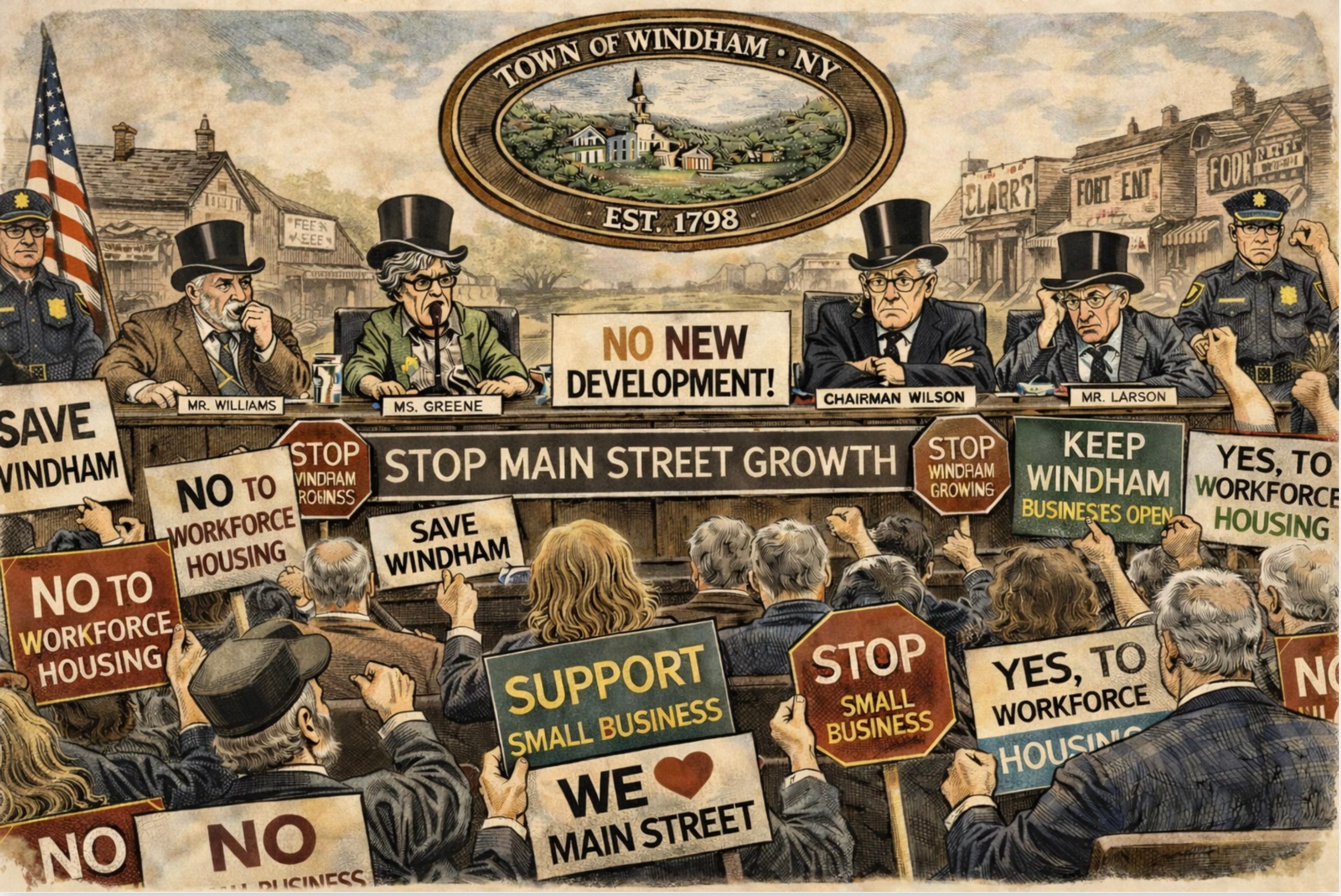 Ask yourself this simple question: How important is a vibrant Main Street to a community like Windham? Communities without vibrant Main Streets are dead ghost towns. A recent Overlook News article about the embattled Phoenicia hamlet in the Town of Shandaken, called “Death by A Thousand Cuts in Phoenicia,” nicely pointed out how areas with a stagnating or declining Main Street show larger patterns of decline. We see that in the Town of Hunter, our close mountaintop neighbor that has empty buildings on its Main Street, reduced economic growth. The same can be said for many local towns in this region of New York. And Windham is sadly rushing headlong into a future where Main Street will stagnate and decline due to the current zoning proposal’s hostility towards commercial activities.