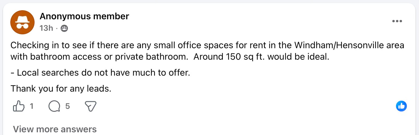A recent post on Facebook shows people would love a smaller space than the 400 sq. ft. required by our new zoning proposal once adopted. These nonconforming spaces of 100-399 sq ft in floor area will not fit within our new area regulations in the new Zoning Proposal once adopted. In short, if you want a 150-399sq-ft office space after the Zoning Proposal is adopted and none exist, you will only get 400 sq-ft choices. This sounds trivial to some, but it isn’t. If you are on a budget that is tight for your new start-up business and they are renting office space at $5.00 per square foot, then a 150 sq-ft office is $750.00 per month, while the larger 400 sq-ft office is $2,000 per month. The extra $1,250 in rental fees per month might be the difference between you opening your business in Windham or moving your business and perhaps your home to another community that is less restrictive and thus cheaper. Make no mistake, these types of increases in costs are exactly what our zoning proposal creates by creating floor area minimum standards. This is by design, not by necessity.