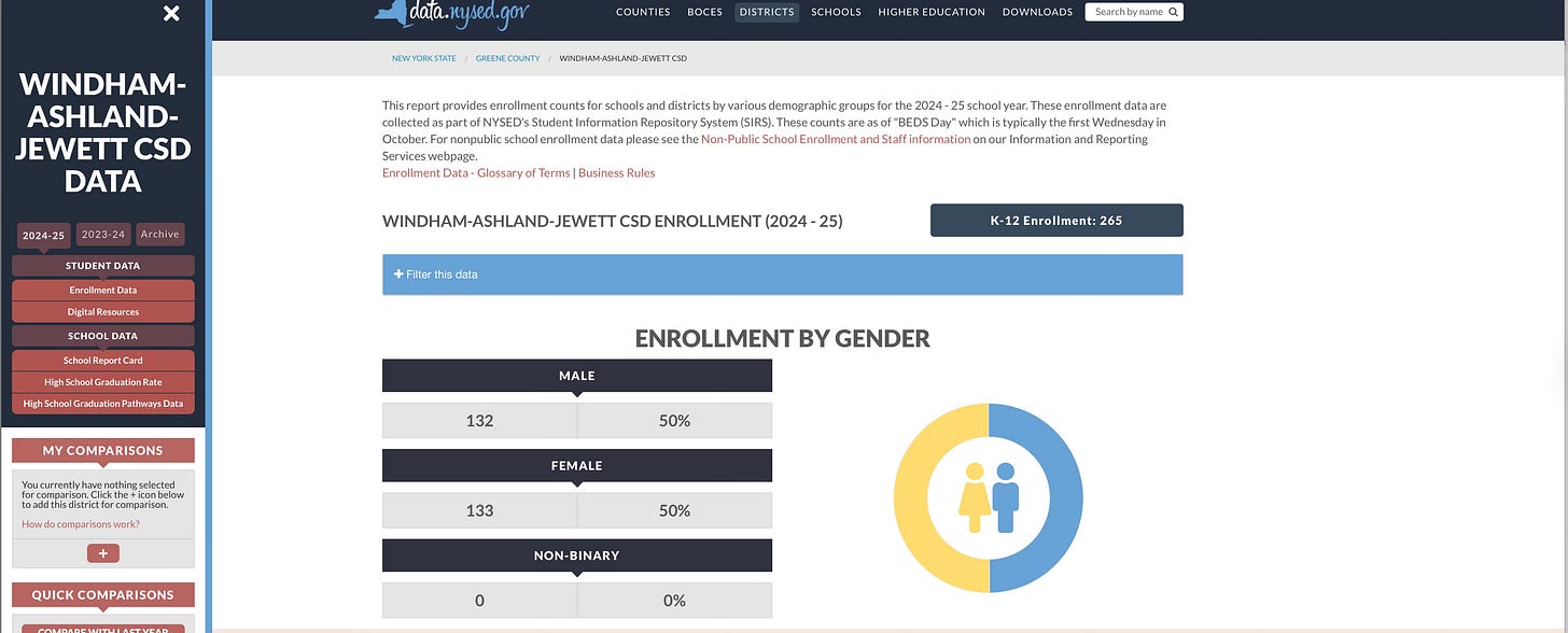 Windham reported in the 2024-25 school year that 265 students were present in our central school district. If one averages this out for the communities involved, it means fewer than 76 students per town are now enrolled in the school. It isn’t hard to see, in another 10 years, how the Windham-Ashland-Jewett Central School District might end up with fewer than 200 students enrolled K-12. Fortunately for WAJ, we are not facing single-digit class sizes for some time yet. However, the town of Andes, Ny is facing single-digit class sizes with a total enrollment of 64 students K-12 in Andes, Central District School. It is hard to see a future where Andes lasts much longer with a school-aged population so low. And Windham is facing these same problems in the future.