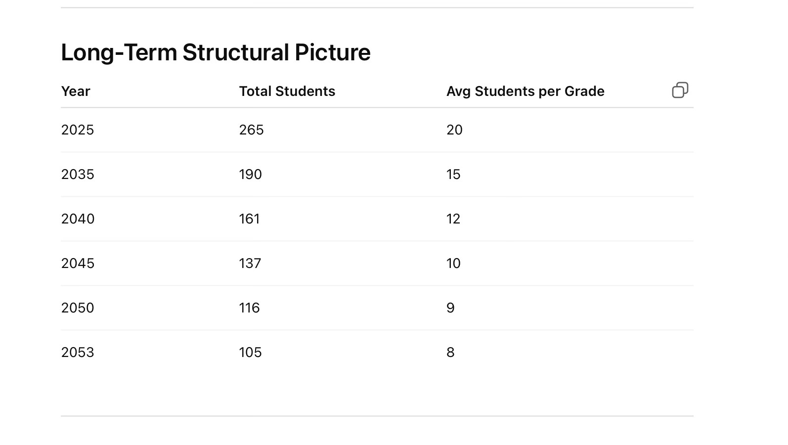 If we make a few assumptions about stable decline, we will find that our school’s enrollment will fall to fewer than 200 total students by the 2036-2037 school year. This is using modelling that doesn’t take into account any general population trends. Now, when I input these trends in the community decline as well, the 2052-2053 school year enrollment falls to around 105 students. The school’s enrollment falls below 200 by the 2033-34 school year. By the 2046-47 school year, the average class size will be 9.8 students, and by the 2052-53 school year, classes will average 8.1 students.